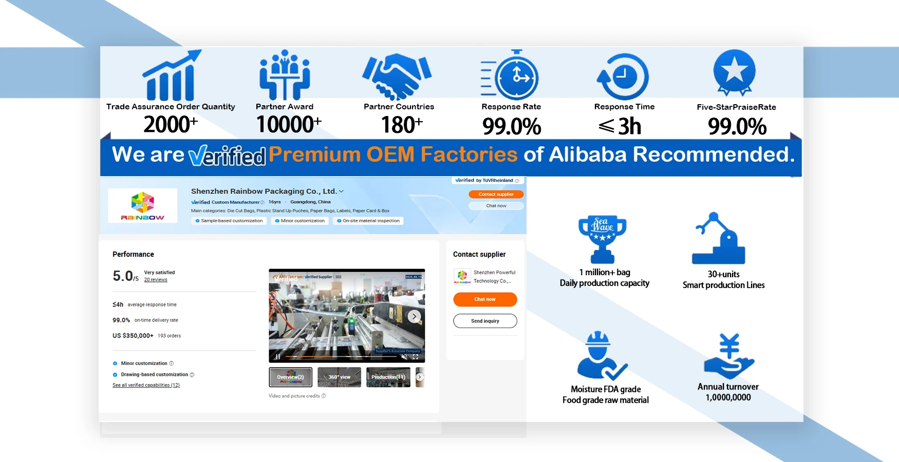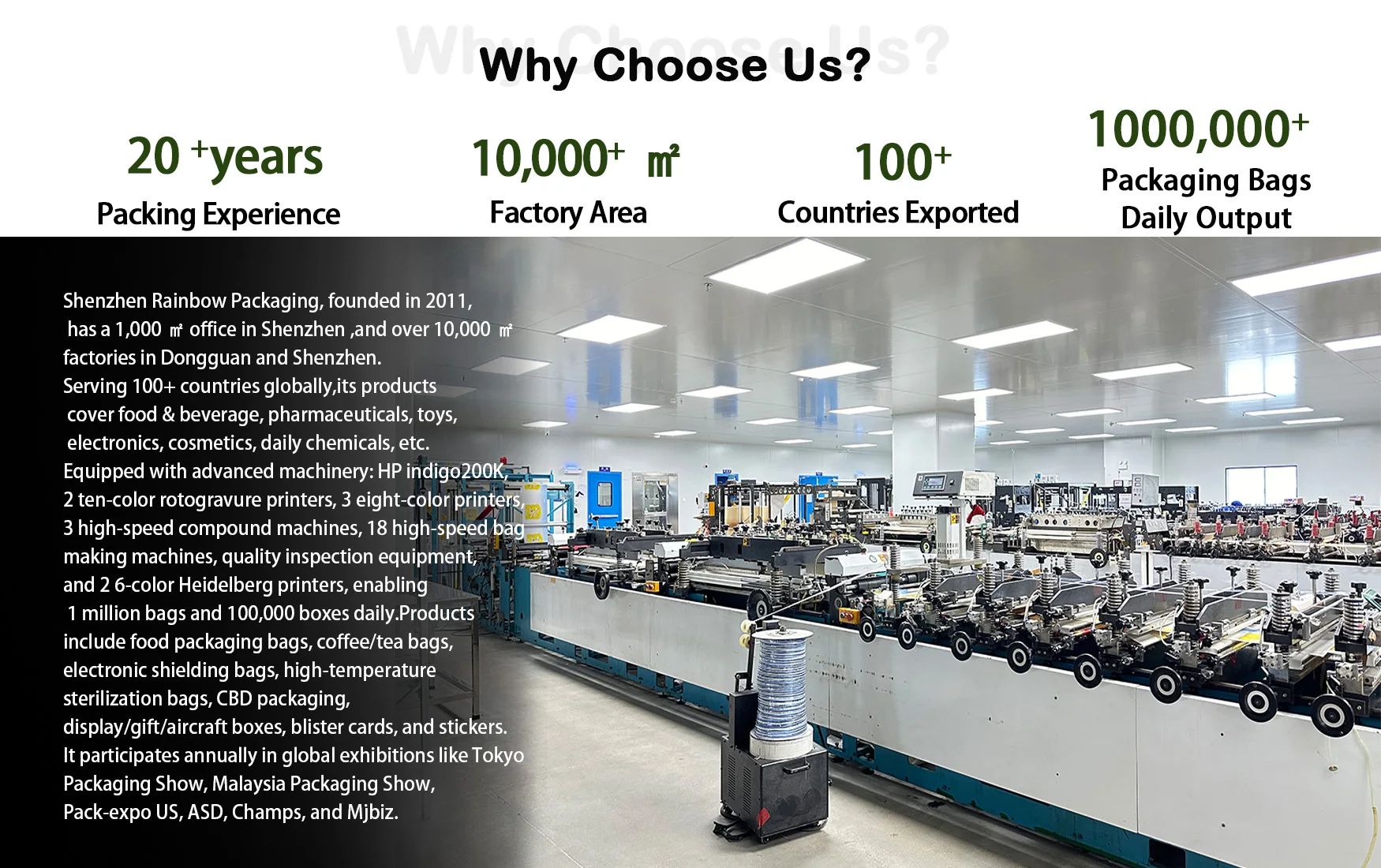 Shenzhen Rianbow Packaging, founded in 2011, has a 1,000㎡ office in Shenzhen and over 10,000㎡ factories in Dongguan and Shenzhen. We have been committed to providing professional solutions for the printing and packaging industry for 16 years. The 5000 square meter factory has 3 floors of production department (including printing, lamination, edge cutting, material folding, sealing, quality control, packaging, etc.), we have more than 50 production machines and more than 150 workers.